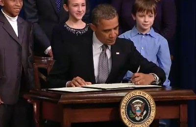 The picture is from a real event, and it really involves gun laws, but that’s about all that is true. The kids in the picture wrote letters to Obama in the wake of the Sandy Hook shooting. They were invited to be present when he signed some “common sense” gun laws to regulate guns just a teeny tiny bit. But “any” means “too much” to the NRA, ya know. The majority of people, gun owners included, are in favor of such common sense laws. But not the NRA, no sir.