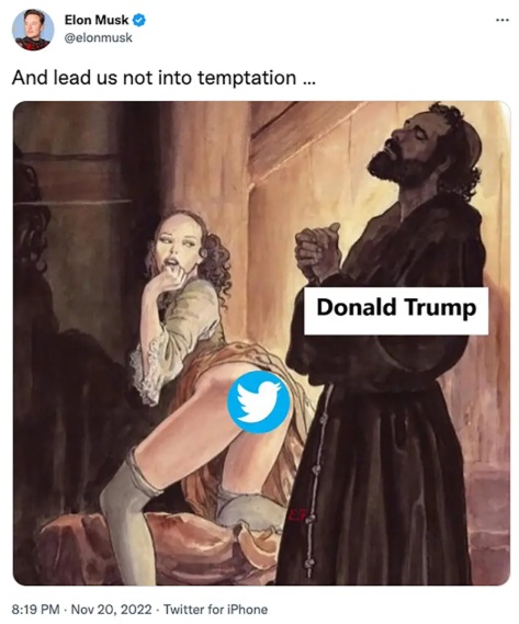 And here’s one from Musk trying to attract Trump back to what was then still called Twitter: