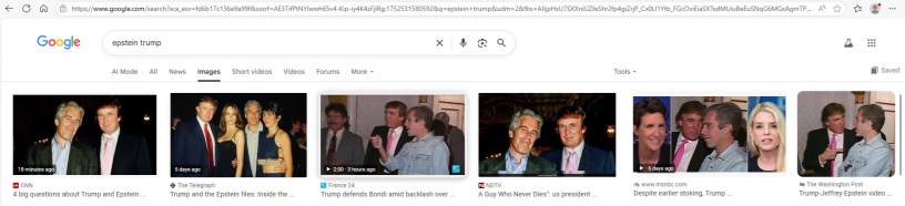 Gotta admit I’m baffled by all this fuss about seeing Epstein’s list. I mean I get that they said they had it and then they said they didn’t and now Trump says Obama wrote it or Hillary wrote it or some such. So that’s all very fishy. But anyone can do a Google image search, right? And there are plenty of pictures of Trump with Epstein. And Clinton with Epstein too for that matter. So why do we need to see a list?